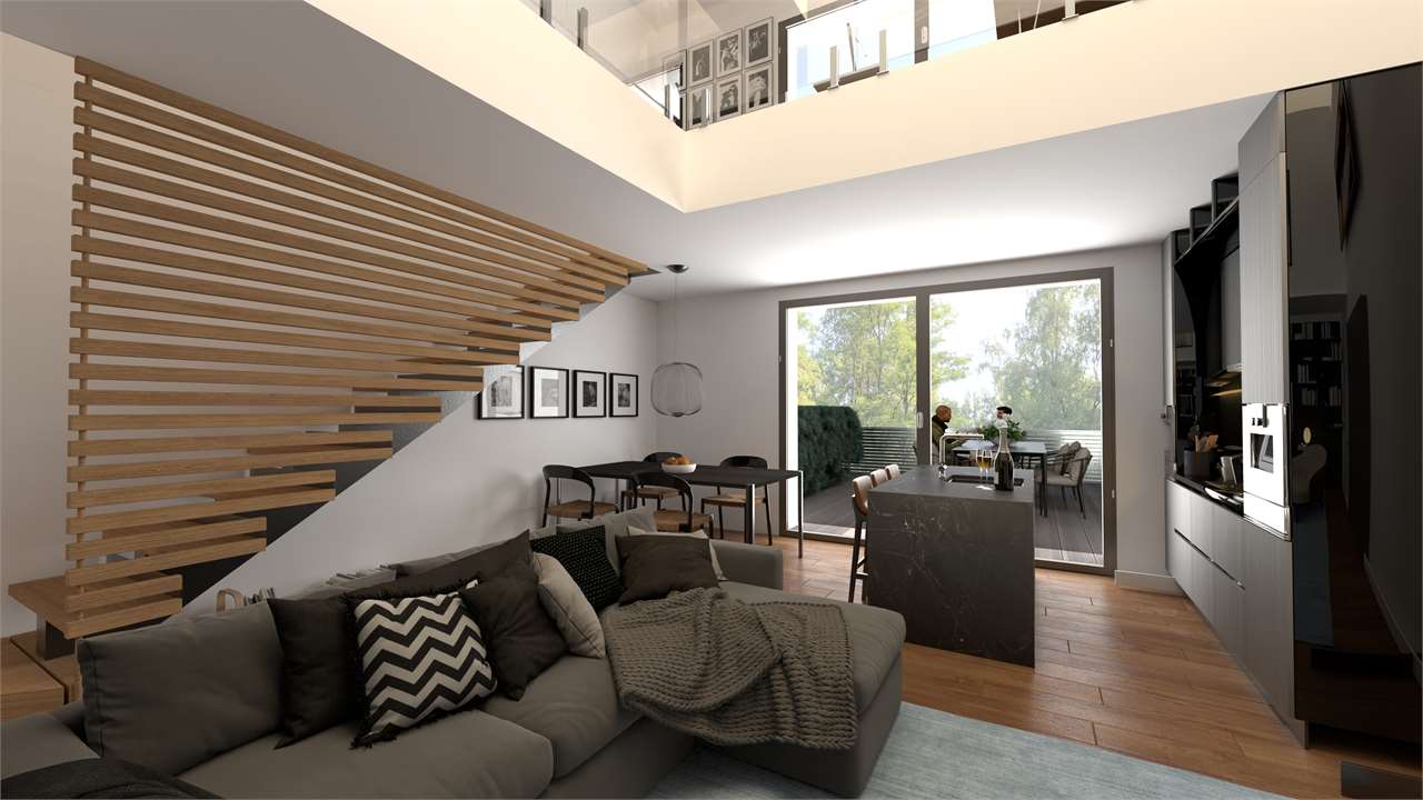 All’entrata siamo subito accolti da un’ ARIOSA ZONA LIVING con cucina a vista e accesso diretto al TERRAZZO di circa 35 mq, che vi farà vivere indimenticabili momenti in famiglia e con amici; competa il piano la prima camera da letto e il bagno di servizio; proseguendo nella zona notte al piano secondo tramite scala interna, accediamo al corridoio, con affaccio sul soggiorno sottostante, che consente l’accesso al bagno padronale e alle altre due comode camere da letto. L’AUTORIMESSA al piano terreno per il ricovero dell’autovettura completa la proprietà, possibilità di acquisto sia box singolo che doppio.